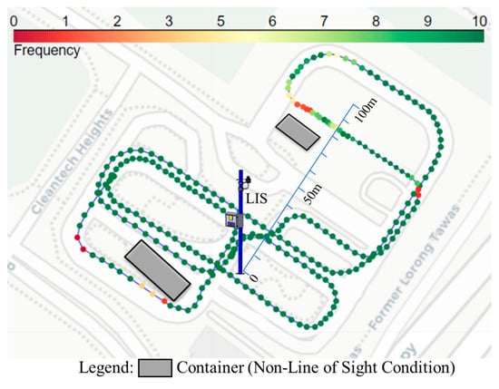 In the experiments, the PDR was measured in one direction by comparing the Apollo logs of the sender and receiver. Notably, there were no packet losses in the Ethernet connection of the LIS system throughout all experiments. The frequency of point cloud measurement was 10 Hz. The PDR data, however, showed variations in building occlusions. In all occlusion scenarios, the CV was close to and remained visible to the LIS. Therefore, the PDR data presented in this section were primarily derived from the full test track data. Figure 9 shows the location of the LIS, the vehicle’s driving route, and the PDR data of the vehicle at different locations. The vehicle traveled along the blue line depicted in Figure 9 at an approximate speed of 15 km/h. The color variations of the circles in the figure indicate the PDR at specific locations, with areas lacking color indicating that no messages were received at those locations.