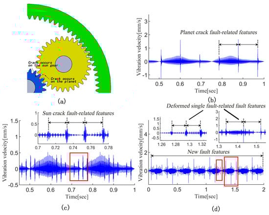Based on the author’s previous research works [33,34], Figure 1 exhibits the simulated vibration signals of a planetary gear set with the planet gear crack, sun gear crack and compound gear cracks, respectively. For the single crack fault cases, a series of abnormal impulses with a fixed period appear in the time-domain as the cracked tooth engages with the matching gear. As shown in Figure 1d, the compound fault-related features contain the information of two kinds of single fault-induced features. However, it is not simply the superposition of single fault-induced features. When two cracked teeth are engaged simultaneously, the two types of anomalous pulses will be coupled and form new fault features; meanwhile, the single fault-induced features are also deformed. Therefore, it is difficult to identify the fault components contained in the compound fault signal.