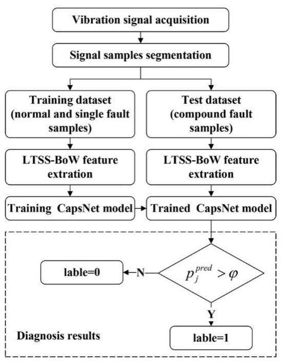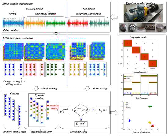 Taking advantages of LTSS-BoW-based vibration feature extraction, coupled with CapsNet-based decision-making, a novel framework is proposed to diagnose the compound fault of a planetary gearbox. To summarize, the detailed steps are given below and shown in Figure 6.