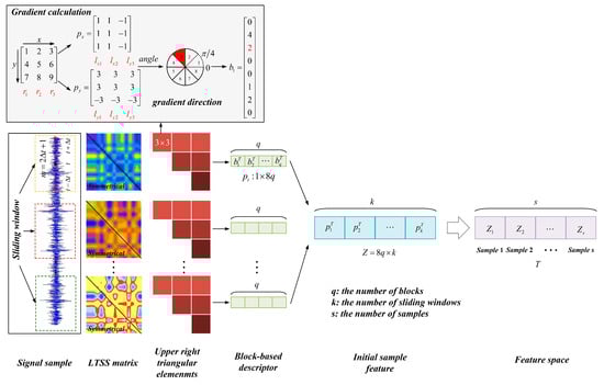 Figure 3 shows the proposed LTSS feature extraction scheme, which includes three steps: (1) Construct the LTSS matrix from the raw signal. At first, the sliding window is utilized to divide the raw signal sample into a local subseries. On this basis, LTSS matrices of the subseries are constructed. (2) Extract the gradient feature of the LTSS matrix. The upper right triangular elements of the LTSS matrix are divided into several blocks. Then, the gradient of each block is calculated to construct the block-based descriptor. (3) Transform the signal sample to a sequence of LTSS feature vectors. The signal samples are represented as a sequence of LTSS feature vectors, and all these samples are then gathered together to form a feature space. The detailed steps are given as follows.