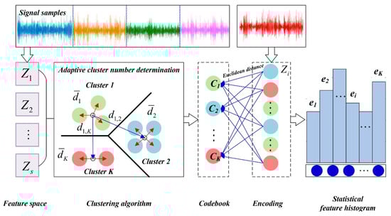 Histogram is an accurate representation of the distribution of numerical data, which has been widely employed in image processing, quality evaluation and time-series processing [29]. Assume that a new signal sample has been expressed as the LTSS feature vector form, for each point of the LTSS feature vector, the Euclidean distance between it and all the codewords in the codebook are calculated, and the codeword with minimum Euclidean distance is assigned to replace this point. Thus, the LTSS feature vector is described by a series of nearest codewords, and the frequency of each codeword is gathered to construct the statistical feature histogram, i.e., .