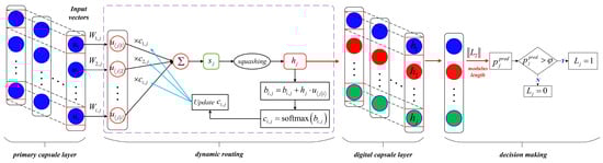 The entire process of the dynamic routing algorithm can be divided into four steps as follows. The margin loss function and average threshold adopted for decision-making are described in Section 2.5 and Section 2.6, respectively.