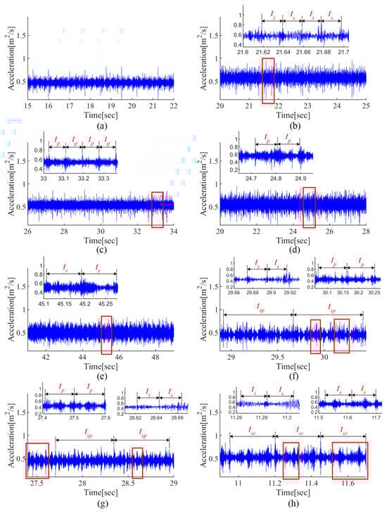 Figure 9 shows the normalized time-domain signal for each fault pattern. It can be observed that the gear fault can induce impacts with a fixed period, i.e., , , , in the time-domain signal. Compared with the single fault patterns, the coupling effect between multiple faults makes the vibration characteristics more complicated in compound fault cases. It is worth noting that new fault features occur due to the coupling effects, i.e., and ; meanwhile, the single fault-induced features are also deformed. Therefore, it is difficult to manually identify the compound fault components from the raw signal.