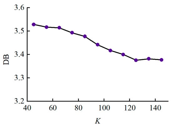 The length of sliding window and cluster center number K have a great influence in the calculation efficiency and accuracy. Considering the calculation complexity of the LTSS matrix, the parameter is set to take value from the range with a step size of 3. is adaptively determined by DB index as described in Section 2.3.2. The smaller the DB index, the better the clustering results, so the best cluster number is set to 125 as shown in Figure 10. For each sample, the output matrix size is after extracting basic features through the LTSS-BoW model.