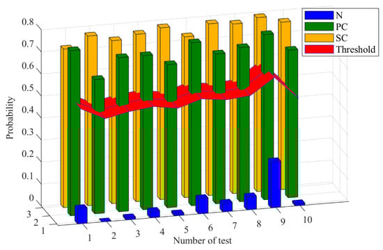 For compound fault diagnosis task 1, the predicted probability values for each pattern are listed in Table 3 and shown in Figure 11. The LTSS-BoW-CapsNet model is trained based on the signal samples of normal, SC and PC patterns. Then, the trained model is tested based on the signal samples of an SC–PC compound fault pattern. In our experiments, each task was performed independently ten times to eliminate the influence of randomness. For all tests, the predicted probability values for the existence of SC and PC fault patterns are significantly higher than the average threshold, while the predicted probability values for normal patterns are far below the threshold. Therefore, the class labels of SC and PC fault patterns are equal to 1. Thus, the model accurately identifies the fault components of the SC–PC compound fault pattern and can output two single labels simultaneously. A similar procedure can be used to analyze the multi-label output results in task 2 and 3.
