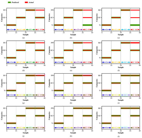Label outputs of four diagnosis methods for three compound fault diagnosis tasks (a–c) LTSS-BoW-SVM model; (d–f) CNN model; (g–i) CNN-CapsNet model; (j–l) LTSS-BoW-CapsNet model.