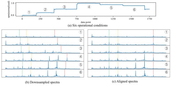 Figure 1 demonstrates the effect of spectra alignment under six different operating conditions (①–⑥). Figure 1a shows the six working conditions of the spectra, Figure 1b shows the result of reducing using a ratio of 10:1, where the square root of the quadratic sum of the 10 data points is taken in order to be consistent with the operation of spectra alignment, and Figure 1c shows the result of spectra alignment with the parameter equal to 10. Three frequency components significantly correlated with the rotational frequency are marked with dashed lines of three colors in Figure 1, and since each spectrum corresponds to a different rotational speed, the corresponding frequency components in Figure 1b all have different positions which are related to the rotational speed, while in Figure 1c, the corresponding frequency components are all at the same position.
