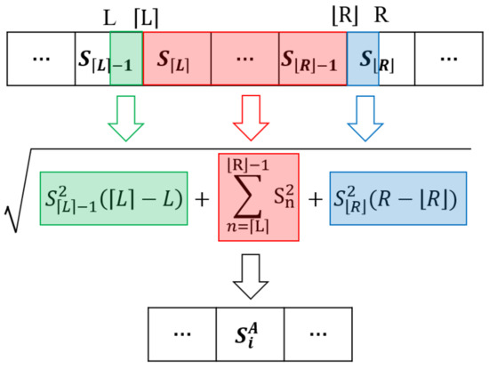 where L and R are the left side and right side of the merging range, denotes rounding down to the nearest integer, denotes rounding up to the nearest integer, is the i-th term of the aligned spectrum, is the n-th term of the original spectrum. The i-th data point of the merged spectrum is obtained by combining L-th to R-th data points of the original spectrum, but since r is not an integer, the head and tail data points need to be sliced during the merging. The computation process of Formula (6) can be more readily comprehended through Figure 2. A special case is that when L is equal to 0, cannot be calculated—it should be set to zero—and when R is equal to the length of the spectrum, also should be set to zero. This adjustment ensures the proper calculation of the formula.