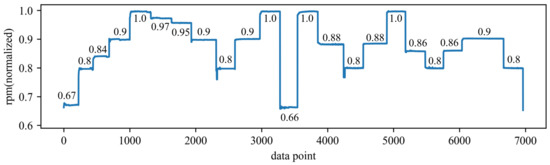 where is the rotational speed corresponding to the spectrum, and is the maximum rotational speed of the training set. The maximum compression rate is decided according to the actual situation, and its value should be at least larger than the ratio of the largest rotational speed to the smallest rotational speed in the training set; otherwise, some of the spectrum compression rates will be less than 1. A larger can be chosen to reduce the data length when the spectral data are long, which can reduce the number of neural network parameters, similar to pooling operations. Define as the length of the compressed spectrum corresponding to the maximum compression rate. In order to ensure the same length of the compressed spectra, only the first data points are retained in each spectrum. In practice, the test set may have a higher rotational speed than the training set, so a figure smaller than can be chosen as the length of the retained data.