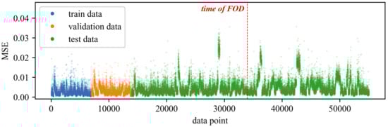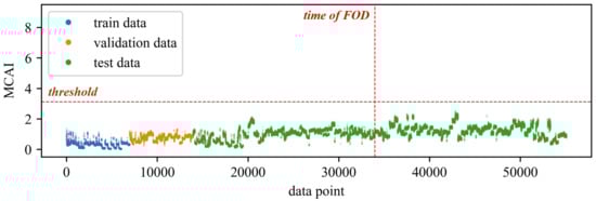 The effectiveness of the proposed method is validated using a set of vibration data collected from a real gas turbine. The signal is captured using a data acquisition unit with an acceleration sensor installed in the horizontal of the inlet casing as shown in Figure 5. The data were sampled at a frequency of 51.2 kHz with a sampling interval of 3 s. Each sample consists of a vibration signal of 0.32 s, resulting in a sample length of 16,384. The dataset comprises eight test runs. Figure 6 illustrates the variations in the low-pressure compressor’s rotational speed during the first test run, with the subsequent seven test runs exhibiting similar patterns. The speed value in Figure 6 is normalized by dividing it by the maximum speed value, and it is only used to show the trend of change in working conditions. During the fifth operational run, an incident of Foreign Object Damage (FOD) occurred due to the ingress of small metal fragments into the low-pressure compressor. The suddenness of FOD makes it unpredictable. The magnitude of this failure was so minor that it did not even affect the normal operation of the combustion turbine, and, due to the low level of the failure, resulted in its features being masked by the changing operating conditions. The complexity inherent in these factors renders the detection of such failures exceptionally challenging. The dataset initially contained 64,977 samples, and after filtering out the data during shutdown periods, a total of 55,082 usable samples remained. Among these samples, there are 33,963 samples representing healthy operating conditions and 21,119 samples representing abnormal operating conditions. In the subsequent experiments, the first test run dataset consisting of 6963 samples will be used as the training set, the second test run dataset consisting of 6983 samples will be used as the validation set for model adjustment and anomaly indicators, and the remaining data will be used as the test set.