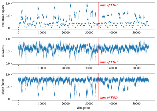 Visualization of three prominent features in traditional features: root mean square, skewness, and shape factor.