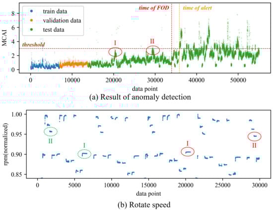 In this experiment, the model is configured with 32 latent variables, and both the encoder and decoder have two hidden layers with 64 neurons each. The optimizer used is Adam with a learning rate of 0.001. The parameter b is set to 0.01, and the parameter d is set to 0.001. Figure 9 and Figure 10 show the anomaly detection results obtained without and with spectra alignment, respectively. Additionally, Figure 11 shows the training curves of the two models. The alarm threshold is determined based on the validation set and is set to three times the 95th percentile of the anomaly index in the validation set. In Figure 9, on the whole, it can be observed that the anomaly index shows a slight increase after the occurrence of the fault. However, it is difficult to determine the occurrence of the fault from the graph. In Figure 10a, the anomaly occurs at the 33,964th data point, and the alarm is triggered at the 35,845th data point, which is approximately 1.5 h after the occurrence of the fault. The false alarm rate is about 0.15%. Indeed, given the relatively mild severity of the fault, its impact on the engine’s operation was minimal. The detection of the fault occurred during an internal bore inspection conducted after the engine had been in continuous operation for a certain duration. In comparison to the aforementioned scenarios, the proposed method was able to detect the anomaly earlier. There are two main reasons for the delay in the alarm after the occurrence of the fault. Firstly, the fault had a relatively low severity, and some operating conditions, especially low rotational speed, did not exhibit significant anomalies in the vibration data. Secondly, the limited training data coverage contributed to the issue. The training data covered a narrow range of operating rotational speeds, and data points with speeds outside the training range resulted in higher anomaly indexes. To reduce false alarms, a higher threshold was set for the alarm, leading to a delay in detection. The difference in rotational speed between the data points with high anomaly scores and the data in the training set is shown in Figure 10b. The two red circles on the right correspond to the high-anomaly regions in Figure 10a. The two green circles on the left represent the rotational speed of the corresponding operating conditions in the training set. With a larger training dataset that covers a wider range of rotational speeds, the false alarm rate of this method can be further reduced. Moreover, it would enable faster detection and alarm for faults with higher levels of anomaly.