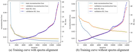 To compare the effect of spectra alignment on the enhancement of fully connected and one-dimensional convolutional layers, DBVAE as well as three other models of classical encoder–decoder structures were used for validation, and the results are shown in Table 2. All models have the same optimizer settings and latent variable count as the DBVAE model discussed in the previous section on processing spectral data. The configuration of hidden layers in the fully connected networks is consistent with the previous subsection. The configuration of encoders and decoders in the networks with convolutional layers is described in Table 3. The value for -VAE models is set to 0.01, and the variation parameter for DBVAE models is the same as mentioned in the previous section. Overall, the effects of using spectra alignment are all significantly better than not using spectra alignment, and the enhancement effect of spectra alignment on the fully connected layer is better than its enhancement effect on the convolutional layer, with the best effect of DBVAE using the fully connected layer. This is because, without alignment, the convolutional layers are able to learn spatial information from the spectrum, resulting in better performance. On the other hand, after alignment, the data are treated as separate features, and the spatial information becomes less effective, leading to the convolutional layers performing worse than the fully connected layers.