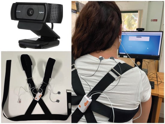 In this experimental study, 20 volunteer participants (9 males and 11 females), with an age range of 24 to 38 (mean age = 29.1 years), were recruited from the university. The stress induction procedure was explained in our previous work [], in which the developed and tested multi-sensor platform was described. It is composed of a wearable and an ambient system. The wearable one is designed to detect heartbeat and EDA in the least intrusive way possible and consists of a shoulder strap equipped with an electronic device. Although wearable devices are the most commonly used method with which to collect physiological data, some studies have highlighted significant measurement errors attributed to the poor placement of the device or rapid movements by the user []. To mitigate physical discomfort and enhance the user experience, optimal points on the body (shoulder and earlobe) have been identified for physiological parameter acquisition. The key factors considered include suitable locations for reliable and clear signals, no restriction of the user’s movements or impediment of work activities, no discomfort during prolonged use, less susceptibility to motion artifacts, stability during data collection, and ease of sensor placement. It is important to note that the emphasis was on sensor placement rather than on belts, the wearability of which can be significantly improved. In addition, to make the acquisition platform more robust and reliable, a low-cost and readily available vision device (Camera RGB) was added for the assessment of eye blinks. Figure 1 shows a picture of the acquisition setup implemented for the data collection phase.