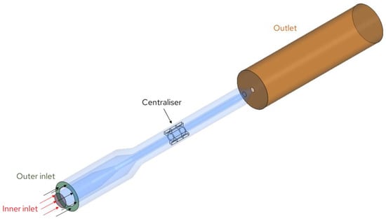 With a targeted sheath air flow rate of 1.25 cm3/min and an aerosol flow rate of 10 and 5 cm3/min, the diameter of the focused aerosol beam is calculated to be 89 or 63 µm, respectively, via Equation (6). The aerosol tube is centred by a centralizer (Figure 7) with manufacturing tolerances of less than 40 µm in total.