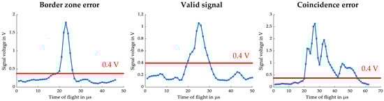Exemplary raw signals for each error category of Figure 10 are presented (Figure 11). Those signals must be filtered. The residence time is determined by the time passed between exceedance and the undercut of a defined threshold of only one detector channel—here, 0.4 V. If a signal is defined as valid on this channel, it is also marked as valid on the other detector channels. The valid signals of all detector channels are stored together with the particle ID and passed to a peak detection algorithm.