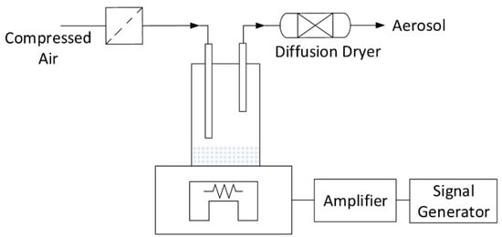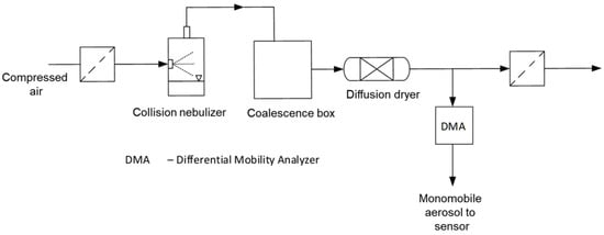 In a self-made Collison nebulizer [41], a sodium chloride solution (10 Ma-%) and a SiO2 suspension were transferred in the gaseous phase (Figure 13). The setup consists of an inlet for filtered air, the nebulizer, a coalescence box, a diffusion dryer filled with silica gel and a differential mobility analyzer (DMA) (Palas GmbH, Karlsruhe, Germany). By increasing the residence time inside the coalescence box, larger agglomerates are formed. The resulting aerosol is dried by the diffusion dryer before entering the DMA. The aerosol is classified based on its electrical mobility, allowing only particles within a narrow range of mobility to exit through the output slit. This monomobile aerosol is guided to the previously described sensor.