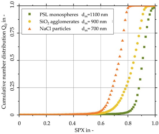 In addition, the slope in the cumulative distribution of the SPX increases with the uniformity of the shape of aerosol particles. The PSL particles are highly uniform, whereas the SiO2 agglomerates show the greatest shape variation.
