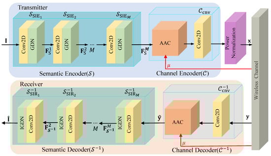 For the effective extraction of image semantic information, Convolutional Neural Networks (CNNs) are utilized in the design of and . As depicted in Figure 2, comprises M Semantic Information Extraction (SIE) layers, denoted as . Each layer encompasses a 2D convolutional layer, a Generalized Division Normalization (GDN) layer, and an activation function. The local perceptual capabilities of the convolutional layer enable the efficient extraction and recovery of semantic information such as colors, textures, shapes, and image contents. The nonlinear manipulation afforded by the GDN layer facilitates the extraction of more complex semantic information from the input image, ensuring spatially adaptive normalization. This aspect is pivotal in reducing spatial redundancy and more effectively capturing the image’s spatial structural information. The sequential layering of the SIE modules effectively extracts the image’s semantic information. The semantic information output by the semantic encoder, denoted as , can be represented as