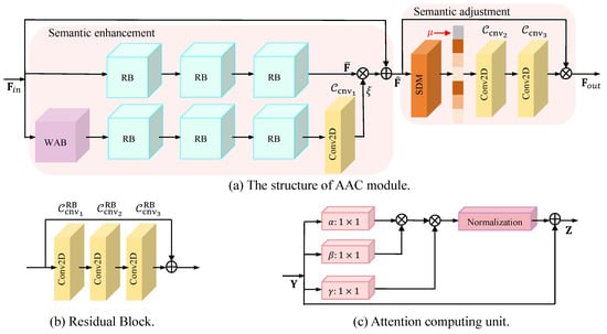 where and are cross-channel transforms, and and are weight matrices. In order to improve the learning ability of the model, three RBs are used after WAB; then, a convolutional layer, followed by a Sigmoid function, is used, generating factor . Finally, by weighting and residual operations, is obtained, which has clearer semantic information. Here, , , and denote the semantically enhanced feature map width, height, and number of feature channels, respectively. The process can be expressed as .