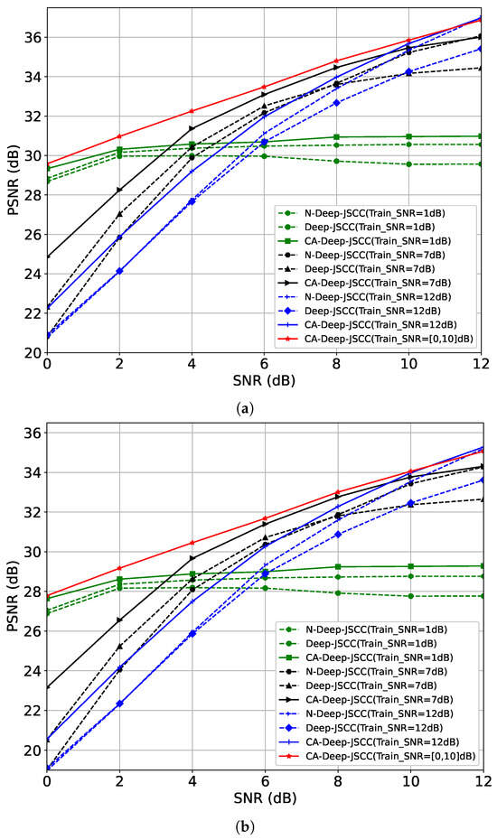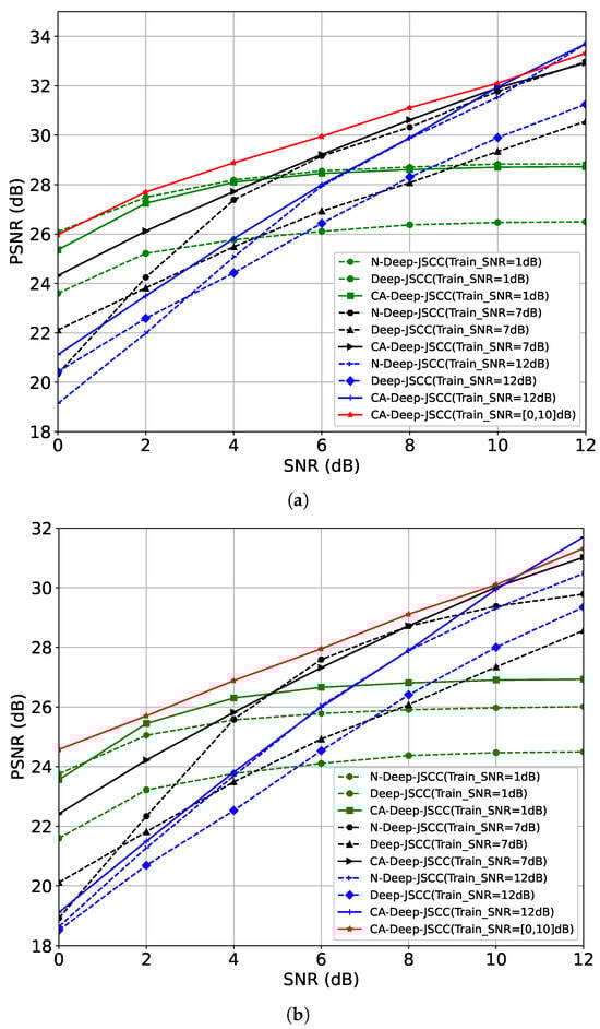 Model performance on Kodak. Each curve of Deep-JSCC and N-Deep-JSCC was trained at a specific SNR. The curves of CA-Deep-JSCC were trained at 1 dB, 7 dB, and 12 dB with 0–10 intervals of 2 SNR. (a) Reconstruction distortion of Deep-JSCC, N-Deep-JSCC, and CA-Deep-JSCC on Kodak, . (b) Reconstruction distortion of Deep-JSCC, N-Deep-JSCC, and CA-Deep-JSCC on Kodak, .