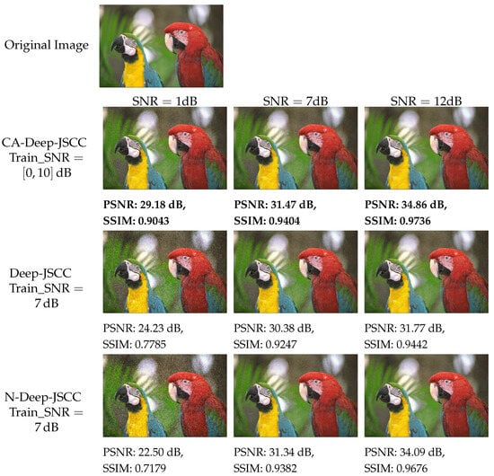 To facilitate an intuitive visual comparison, a comparative analysis is presented between the CA-Deep-JSCC model, the Deep-JSCC model, and the N-Deep-JSCC model using sample images from the Kodak dataset in Figure 6. It can be observed that the quality of the reconstructed images of both the schemes improves as the SNR increases, which is quantified by the increase in PSNR and SSIM. The CA-Deep-JSCC scheme exhibits higher values of PSNR and SSIM in all SNR conditions, which indicates its superiority in the task of semantic communication of images.