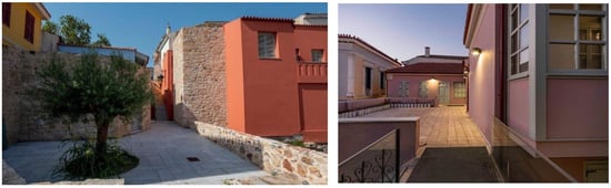 The Museum of Modern Greek Culture (MNEP) (Museum of Modern Greek Culture, in Monastiraki, Athens, Greece. Expected to open to the public in 2024, http://www.mnep.gr/, accessed on 5 January 2024) was selected as a testbed to validate the MELTOPENLAB concept, information system, and applications. MNEP, situated in a multi-building complex in Monastiraki, one of the most touristic spots near the centre of Athens, is the only public museum dealing with the tangible and intangible aspects of modern Greek cultural heritage. For more than 100 years, MNEP has been rescuing, studying, and highlighting everyday life and ritual symbols and objects, information on morals and customs, traditional arts, and techniques that make up the modern Greek reality. Figure 1 depicts indicative views of the MNEP building complex.