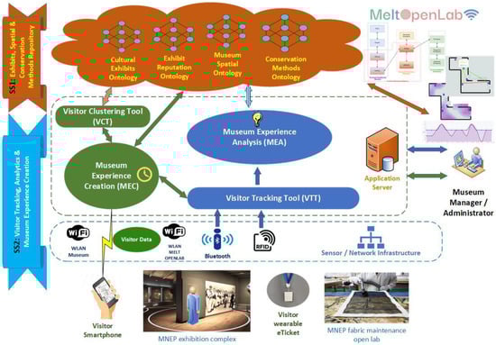 The article’s organisation is as follows: Section 2 presents the fundamental technological components the MELTOPENLAB system comprises, and relevant literature, along with rationales for their adoption. The first one is digital content management of the museum exhibits, through traditional metadata schemes and those that enable the implementation of novel services to visitors and curators (i.e., evaluation/reputation ontologies, spatial allocation and navigation ontologies, and conservation/restoration methods ontologies). The second fundamental technological component is visitor detection/tracking. Indoor Positioning System (IPS) topologies, techniques, and technologies are presented and evaluated in the context of the MELTOPENLAB concept. The third component relates to aspects of visitor experience such as visitor movement behavioural models, classification techniques, personalisation, and visitor experience quantification. Section 3 builds on Section 2, presenting the MELTOPENLAB approach in terms of the system’s functional architecture and the rationales for adopting solutions. Section 4 discusses issues related to the implementation and pilot testing of the system, providing preliminary results, and the work concludes with Section 5, presenting conclusions and future research.