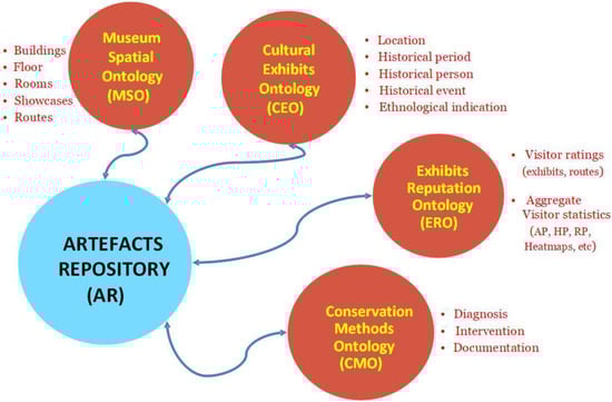 As mentioned earlier, a crucial component of MELTOPENLAB is the artefacts repository (AR), in which the information on cultural exhibits is organised, mapping all possible relations between artefacts, conservation methods, spatial attributes, and user evaluations, thus defining the following ontologies, based on the framework introduced in Section 2: