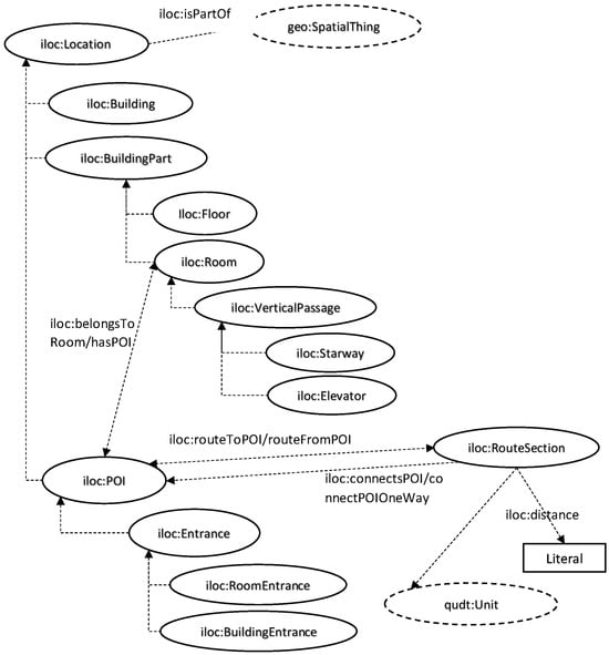 - Location: This is used to represent entities that describe locations within indoor spaces and can connect both internal and external areas. It includes subclasses such as Building, Building Part, and Point of Interest (POI).