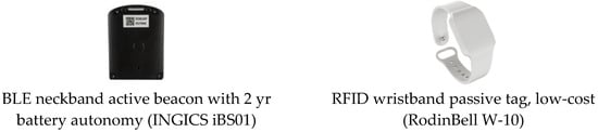 Visitor e-ticketing solutions that are popular among museum managers, for security reasons and statistics collection, were adopted in MELTOPENLAB, to address the above user-device issues. Considering low supply and maintenance costs, market availability, and compatibility/interoperability with existing solutions as critical aspects, MELTOPENLAB concluded that the most appropriate e-ticketing technologies to integrate with selected tracking technologies were RFID ARPT (Active Reader Passive Tag) and BLE, in the form of wearable, low-cost wristbands and energy-saving, wearable neckband beacons, respectively, ensuring a stable, detectable signal. Figure 6 depicts the two types of wearable e-tickets supported in MELTOPENLAB.