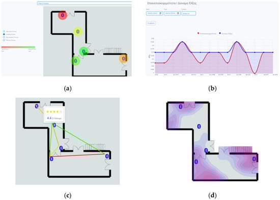 Management application (MEA)—indicative graphs. (a) Holding power per cell (red > orange > yellow > green) in museum building D. (b) Revisitability (red) and attraction power (blue) per e-ticket and period in museum building D. (c) Popular routes (red > orange > green) and visitor ratings. (d) Heatmap of museum building D, based on visitor density for a given period.