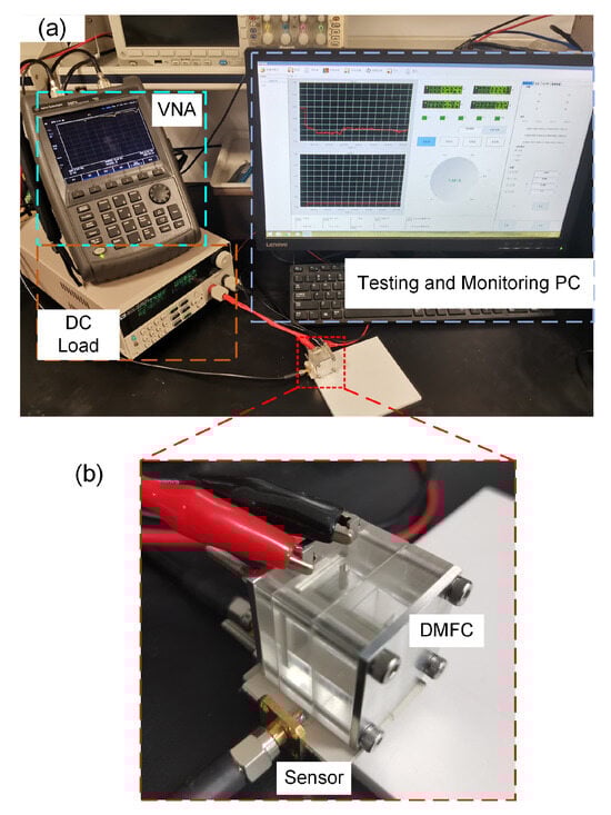 The proposed device of a self-breathing transparent μDMFC integrated with an RF resonance sensor was fabricated in order to verify the simulation results. First and foremost, a piece of 5-layered MEA with 1 cm2 active area was fabricated using the catalyst-coated-membrane (CCM) method. We employed a Pt-Ru/C catalyst of 4.0 mg cm−2 loading on the anode and Pt/C catalyst of 2.0 mg cm−2 on the cathode, with a Nafion117 membrane in between. Prior to the experimental tests, the following activation process was conducted at a temperature of 60 °C: Firstly, deionized water was fed into the anode chamber of the μDMFC to humidify the MEA for over 2 h. Secondly, the fuel cell was maintained at a discharging current density of 3 mA cm−2 for 2 h with 2.0 M methanol solution. Thirdly, the fuel cell operated with a high current density of 30 mA cm−2 until the output voltage reached its maximum value. The current collectors, made of 316 stainless steel, were fabricated by a computer numerical control (CNC) machine. The anode current collector was designed with a grid shape while the cathode current collector had a perforated structure. The anode chamber, made of organic glass, has a volume of 2 × 1.2 × 1.2 cm for methanol solution. In addition, silicone gaskets were fabricated by laser cutting to provide good sealing between the anode chamber, current collectors, and the MEA. Al-based endplates furthermore guaranteed good sealing and electrical contact of the fuel cell’s essential components. Figure 2 illustrates the experimental setup for testing and monitoring. To conduct the electrical tests and measurements, the RF resonance sensor and the μDMFC were connected to an Agilent N9923A RF vector network analyzer (VNA) (Agilent Technologies, Inc., Santa Clara, CA, USA) and an Itech IT8511A+ DC electronic load (Itech Electronic co., Ltd., Nanjing, China), respectively. To automatically monitor the μDMFC in real time, both the VNA and the programmable DC load were connected to a personal computer (PC) through a network and RS232 protocol, respectively. Every 10 s, the status of the μDMFC was recorded and saved in the PC. An enlarged picture of the assembled μDMFC on top of the RF sensor is shown in Figure 2b. The proposed RF resonance sensor with optimized dimensions was fabricated on a 0.508 mm thick substrate with a dielectric constant of 2.52 and a loss tangent of 0.002 using the wet etching printed circuit board (PCB) technique. The side length of the squared substrate is 32 mm. Both the top and bottom of the substrate was covered with a 0.018 mm thick copper layer with a conductivity of 5.8 × 107 S·m. The fabricated sensor was embedded under the anode chamber of the μDMFC and was fixed to the aluminum end plate.