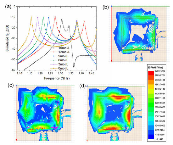 Simulation results of (a) the central frequencies indicated by peaks of S21 of the RF sensor, (b) E-field distribution at 1.23 GHz without load, (c) E-field distribution at 1.04 GHz without load, and (d) E-field distribution at 1.23 GHz with 6 mol L−1 methanol solution.