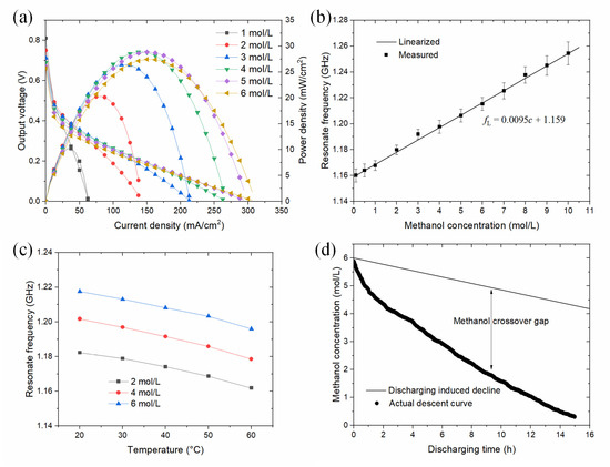 (a) Performance of the μDMFC with various methanol concentrations, (b) resonance frequency as a function of methanol concentration, (c) effect of temperature on resonance frequency, and (d) real-time record of methanol concentration during a long run.