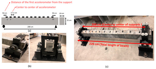 For vibrational measurements, twelve accelerometers (Kistler, Mississauga, ON, Canada, model number: 8315A010B0AC06) were installed along the top surface of each beam with hot glue with spacing of 172 mm (Figure 1a), and they were connected to a Vishay Precision Group model 6100 data acquisition system. The accelerometers were single-axis sensors with an acceleration range of ±10 g, sensitivity of 200 mV/g, resonance frequency of 2000 Hz and mass equal to 15 g. A non-instrumented hammer (weight = 300 g) was used to provide input excitations at different locations along the top surface of the beam.