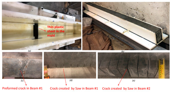 (a) Placement of sheet in the mold for preformed crack; (b) casting of concrete; (c) preformed crack; (d) simulated cracks for beam #1; (e) simulated cracks for beam #2.