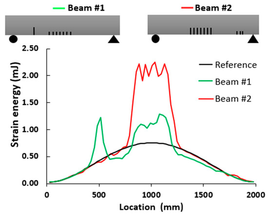The objective of this section is to evaluate the distribution of strain energy within the beams through finite element static analysis. This assessment serves as a distinctive indicator of the damage distribution resulting from multiple cracks. The mesh size and element are presented in Section 2.2. Figure 4 illustrates the average magnitude of the strain energy in the elements located on the top surface of the reference beam, as well as two other beams exhibiting multiple damage locations.