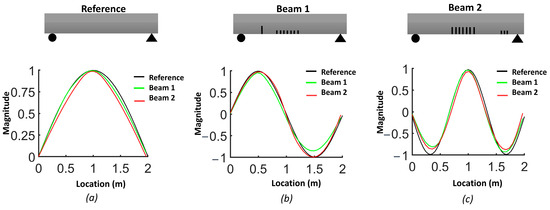 Comparison of the curvature of mode shapes for the three beams: (a) first mode; (b) second mode; (c) third mode.