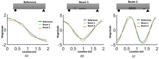 The natural frequencies from the FEM are provided for each beam in Table 3. The results demonstrate how the natural frequency and mode shapes changed in response to the level and location of damage. The position of the distributed cracks was not initially identifiable from the first three mode shapes (Figure 6). However, the slopes and curvatures of the mode shapes significantly enhanced the identification of regions with cracks (Figure 7 and Figure 8). For beam #1, the first and third frequencies had the highest change (15.6% and 11.2%, respectively), as expected, since the cracks in the middle affected the first and third frequencies. Beam #2 exhibited higher changes in the first and third frequencies and lower changes for the second frequency due to the single crack with a 5 cm depth, which had more influence than three cracks with a 3 cm depth.