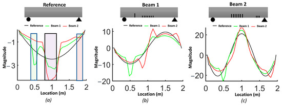 Figure 16 shows a comparison of curvatures for the first three mode shapes between beam #1, beam #2 and the reference beam. The experimental curvature of mode 1 for the reference beam appears asymmetric, likely due to potential experimental uncertainties such as friction at the roller support, non-uniformly distributed fibers, etc. In the case of beam #2, the curvature of mode 1 distinctly increased with damage attributed to the cracks in the middle section of the beam. Similarly, for beam #1, the curvatures of modes 2 and 3 rose near the single crack on the left side, and for mode 1, a shift in curvature toward the side of the crack was observed without a significant increase in maximum curvature.