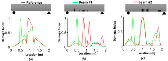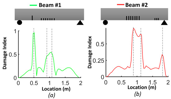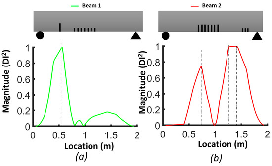 where is the distance between observations. In a previous work [43], Ho et al., defined the damage index of each n-mode by the squared absolute differences in mode shape curvature between the damaged beam (with d subscript) and reference states (with r subscript) as follows: , for each i-position along the beam. For normalization and facilitating a comparison of results across different modes, the normalized damage index for each n-mode was normalized as follows: