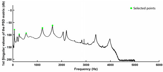 Figure 11 illustrates the selection of singular values from the power spectrum density (PSD) matrix, with green points representing the modal bending frequencies. It is important to note that the peak situated between the first and second bending peaks corresponds to a torsional mode and was not selected.