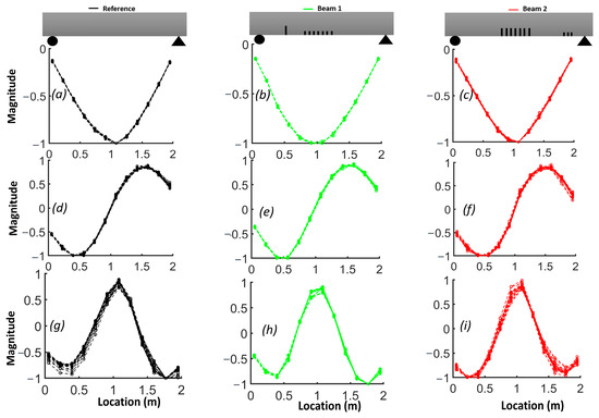 Replicates of (a–c) first mode shapes, (d–f) second mode shapes and (g–I) third mode shapes for reference beam, beam #1 and beam #2.