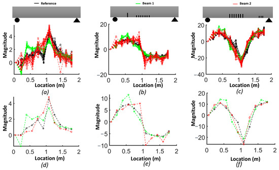 Due to the sensitivity of the second derivative to noise, it is desirable to filter noise prior to its evaluation. For this purpose, each mode shape was smoothed locally with cubic smoothing splines. Figure 14 compares the first, second and third smoothed mode shapes of beam #1 and beam #2 with respect to the corresponding mode shapes of the reference beam. Notably, the first mode shapes for beams #1 and beam #2 exhibited a shift toward the side where a crack was present in the shear zone. The results for the slope of the smoothed first mode shapes show an improved correlation with the presence of cracks (Figure 15). A comparison between Figure 12 and Figure 14, as well as between Figure 13 and Figure 16, highlights the effectiveness of the proposed smoothing methods in reducing the effect of noise on the mode shapes, slopes (Figure 15) and curvature. The unsmoothed mode shapes reveal an increasing degree of variability with higher mode shapes, and this variability was further amplified for slopes and curvature, significantly impacting the detectability of defects. The results for the curvature of the smoothed mode shapes indicate enhanced detection of cracks located in the middle of the beams for the first and third mode shapes. Detection of the preformed crack of beam #1 was improved for the second mode. For beam #1, the increased curvature observed in the second and third modes on the left side was a result of a single crack located 50 cm from the left support. Additionally, the larger curvature in the middle of the third mode can be associated with damage in the middle. For beam #2, the bigger curvature values of the first and third modes in the middle section were due to damaged zones.