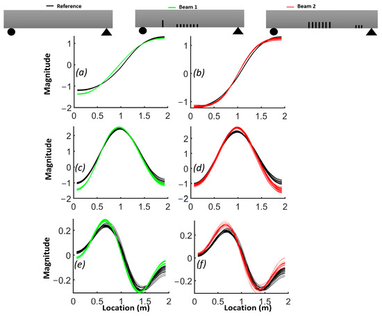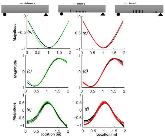 Comparison of mode shapes between beam #1, beam #2 and the reference beam: (a,b) comparison of mode 1; (c,d) comparison of mode 2; (e,f) comparison of mode 3.