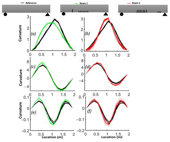 Comparison of curvature of mode shapes between beam #1 and beam #2 and reference beam: (a,b) comparison of mode 1; (c,d) comparison of mode 2; (e,f) comparison of mode 3.