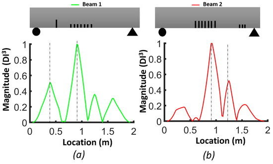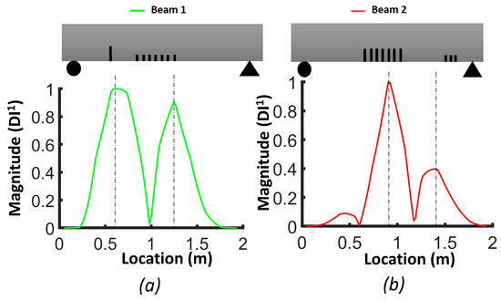 Damage index (DIN) for FEM beams: (a) beam #1; (b) beam #2.