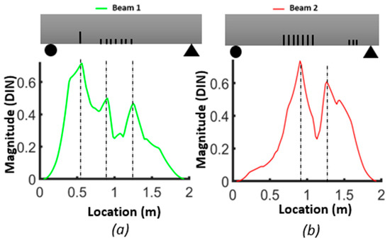 Figure 9 illustrates the damage index (DI, Equation (3)) for the numerical models of beams #1 and #2. The damage index for the first mode (DI1) correctly identified the location of the two levels of distributed bending cracks, as well as the isolated crack located 50 cm from the left support of beam #1. DI2 based on mode 2 was more robust for detecting the single crack in beam #1 and the three cracks in the shear zone of beam #2. The damage index based on the third mode (DI3) had a larger value for all cracks in beam #1 and beam #2. In general, we can conclude that the damage index based on the third mode was better for detecting and localizing the damage. Figure 10 demonstrates the DIN plot for beam #1 and beam #2, with dashed lines indicating the crack positions in the numerical models.