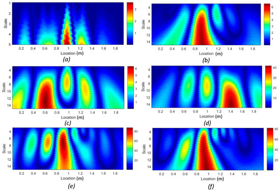This section presents the result of the second proposed noise reduction approach that improves the curvature-based damage detection methods. The continuous wavelet transform of the squared curvature differences for each mode was calculated separately by implementing Equation (10). Figure 21 illustrates the application of the WTC to the numerator in Equation (3) for both beam #1 and beam #2, considering different scales and modes. To address the edge effect problem, wavelet analysis was conducted on the extended signal using a zero-padding approach, ensuring that edge effects occurred outside the length of the beams. It can be concluded that, for all mode shapes, the WTC with a properly large-scale parameter could detect the positions of the cracks. From Figure 21a,b, it is evident that the WTC of the first mode shape curvature difference effectively identified the crack zone in the middle of both beam #1 and beam #2. In the case of the single crack of beam #1, the WTC of the second mode shape curvature precisely pinpointed its location at a scale greater than six (Figure 21c). However, for the shear cracks in beam #2, the WTC indicated the location of damage with a 16% error, representing the largest discrepancy for this denoising method (Figure 21d). Moreover, Figure 21f has higher wavelet scores compared to Figure 21e for the same range in the wavelet scale, suggesting a potentially greater severity of damage in the middle zone of beam #2.